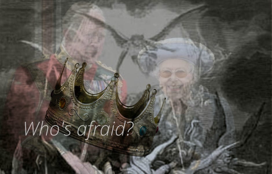 Familierne havde adgang til det finansielle system via såkaldte skærme. Disse skærme havde de samme farver som de ni sten. Efter indsættelsesceremonien forsøgte Kong Charles at koble op til systemet via den blå skærm blot for at finde ud af, at han ikke længere havde adgang til at tilgå de finanser, han havde regnet med. Det kunne han have spurgt sin mor om, der ikke selv havde haft adgang siden 2007. Og her bliver det seriøst sært, for hans mor er ikke hans mor, hvis legeme har ligget i stase under Balmoral Castle i 30 år. Hans mor er et væsen, hvis fremtræden netop er afhængig af, at hun ligger i stase. Det kan næppe være forbigået vores blik, at den skikkelse, der er tonet frem på TV-skærme, ikke har undergået forældelse i disse 30 år. I de seneste optagelser blev der også observeret nogle besynderlige fænomener, hvor hun blev blåligt misfarvet i ansigtshuden. Væsenet mistede altså evnen til at mime hendes fremtoning.
