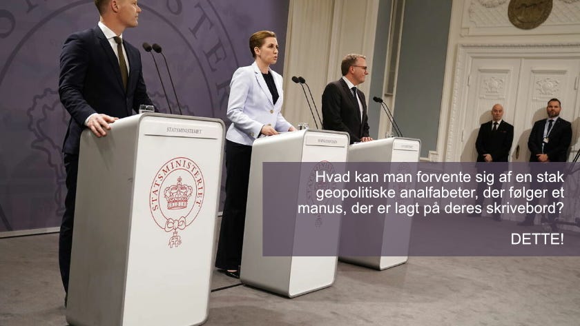 Vi har lige set billeder af Frederiksen-kabinettet stille sig op til pressekonference med krigs-udtalelser, og nu må vi sende tropper til … bla-bla. De gør, hvad de som sprællemænd- og -koner er udkommanderet til af deres globalistiske opdragsgivere derude i gasskyen.
