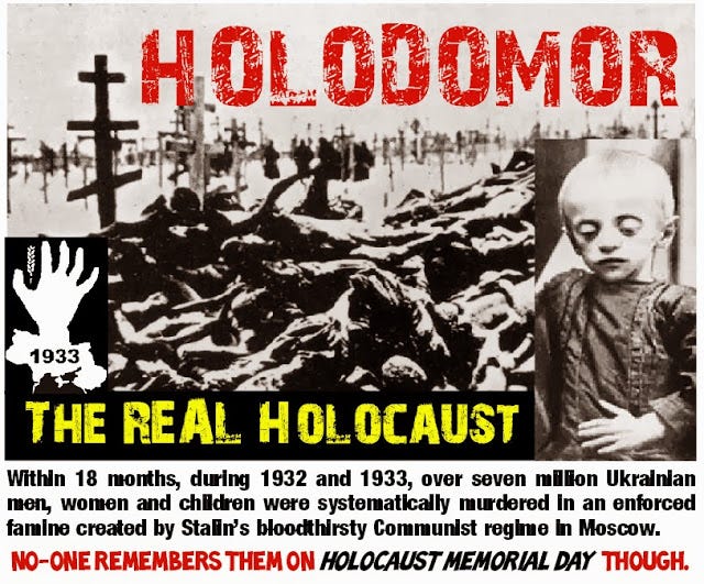 Særlig grelt gik det for sig i Ukraine, Europas brødkurv. Holodomor er navnet for det ukrainske folkemord. 25.000 døde om dagen i det overgreb, som Stalin kaldte for den lektie bønderne aldrig aldrig ville glemme. De ukrainske bønder havde modsat sig kollektiviseringen. Lektien blev i sandhed husket, men på længere sigt var det den modsatte lektie af hans intention. Så stærk blev det ukrainske had til russerne, at en del af befolkningen senere kunne lokkes til at ødelægge deres eget land endnu en gang på oligarkernes og de amerikanske neocons initiativ. Jeg taler selvfølgelig om de nyfascistiske statskup i 2014. Rusland var på ingen måde deres fjende, men gammelt nag kan bruges til ondsinede formål, og de skal siges, at de allerfleste ukrainere var dybt ulykkelige over, at endnu en gang at bliver offer for en psykopatisk stormagtspolitik. Milo kan fortælle om, hvordan de gjorde det i Serbien.