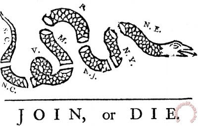 USA blev altså på ingen måde grundlagt på demokrati. Benjamin Franklin, medlem af Grand Orient-logen Les Neufs Seurs, de Ni Søstre, fremlagde et ultimatum for de dengang 13 kolonier: Tilslut jer, eller dø! Dannelsen af føderalstaten var altså med en ladt pistol for panden. Sætningen er malet på væggen i The Library of Congress akkompagneret af en slange. Meget sigende. Det var det samme slogan, som blev brugt i Den Franske Revolution: Vær min broder, eller jeg slår dig ihjel!