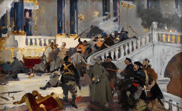 Da magten lå i bosjevikkernes hænder, sagde Lenin til Trotsky: Es schwindelt – jeg er svimmel. Den provisoriske regering overgav velvilligt-frivilligt magten til bolsjevikkerne. Kosakkerne forlod Vinterpaladset. Alt liv i byen fortsatte, som om intet var hændt. Trotsky proklamerede, at den provisoriske regering ikke længere fandtes og at den statslige magt nu lå hos den militær-revolutionære komité. Rødgardisterne ventede pænt udenfor Vinterpaladset. Der fandt ingen spektakulær og heroisk storm sted på paladset, som der står i historiebøgerne, for det hele var en ren foræring, og der fandtes ikke vagter ved sidedørene. Kl 2:10 om natten blev de høfligt afventende rødgardister lukket ind i Malachite-hallen, hvor hele den provisoriske regering var forsamlet, og Vladimir Antonov-Ovseyenko, frimureren og lederen af rødgardisterne fremsagde det kryptiske udsagn: Mine herrer, jeres tid er nu omme. En nærmere astrologisk undersøgelse viser, at solen lige nu står midt i skorpionens tegn ved 14:58 grader. Det var samtidig Trotskys fødselstidspunkt. Frimureri blev opium for folket.