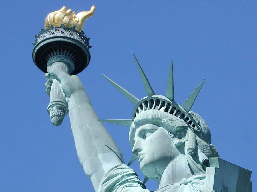Frihedsgudinden er en kombination af to indvielsesgrader i mitræismen. I den 2. indvielsesgrad blev måtte adepten transformere sig til en transvestit med et halvmåne-diadem i håret. En en anden indvielsesgrad kaldet heliodromen eller solvognen bærer vognstyreren faklen med olielampen, som Frihedsgudinden gør. Derudover er der den strittende halo omkring toppen af hovedet, og Mithra ses som regel med denne halo, der er solens stråler. Se i øvrigt gudindens ansigtstræk – ikke specielt feminine må man konstatere. Bartholdi, der kreerede monstret var frimurer, og vi ved, hvordan de konstant svælger i både mitræisme og egyptologisme.