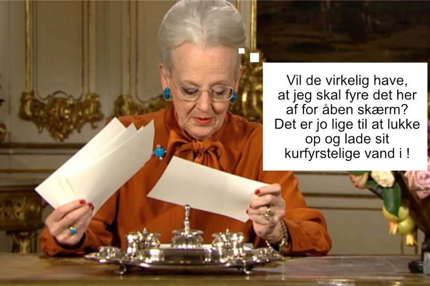 Så fik vi natten over at vide, at kronens sygdom var lagt på hylden, men at krigen var brudt ud i øst. Som det fredselskende folk, vi er, sendte vi straks 700 millioner til de stakkels folk i Ukraine, så deres leder kunne skovle flere penge ned i sin egen lomme, mens hans fascistiske lejetropper organiseret af NATO, Pentagon og CIA kunne bombardere civilbefolkningen i Donbass-regionen, for så kan de lære det. Vi skal ikke finde os i alt, og vi skal være villige til at ofre vores eget velfærd for en retfærdig sag, selv når det retfærdige fortaber sig i det uldne. Vi er ganske vist kun et lille land, men vi har en smuk tradition, der er tusind år gammel med at ligge i selvskabt krig med vores naboer. Vi kan stadig være med, når vi uden tøven vender den anden kind til, så vores gode venner kan bombe den grimme olieledning ved Bornholm.
