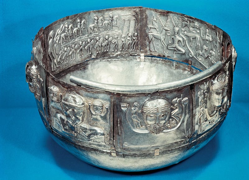 Sølvkaret fra Rævemose ved Gundestrup i netop Himmerland med såkaldt ‘keltisk’ symbolik. Men hvem var disse såkaldte keltere? Læg mærke til den hornede skikkelse på indersiden ved navn Cern/Kern. Han findes fra Sibirien, over den iberiske halvø til Irland.