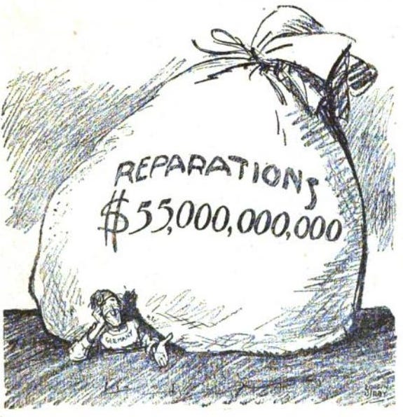 Versaillesfreden 1919 – Tyskland fik både skyld og ubetalelig krigsgæld for en krig, de ikke havde startet eller ønsket. Skyldsofferhandlingen gentog sig efter 2. Verdenskrig.