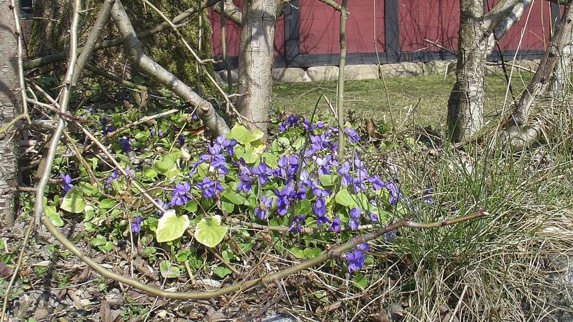 Martsviol i en klosterhave. Henrik Harpestreng anbefaler den mod betændelse, ørepine og hoste.
