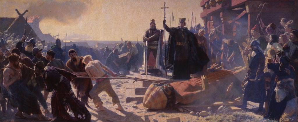Virkeligheden var mindre salvelsesfuld og mere barsk. Der rullede hoveder. Vi ved, at der i lang tid efter i smug foregik en parallel dyrkelse af de gamle guder. Også danskerne gav kejseren, hvad kejserens var.