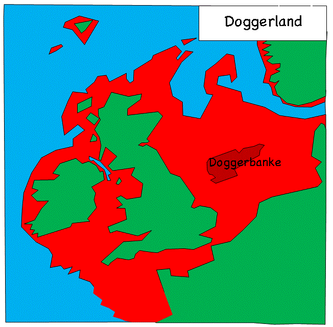 Landbroen mellem Danmark og England. Isen trak sig ikke tilbage på én gang. Isen har bundet store mængder af vand, og derfor har kysterne være længere til havs i forhold til i dag. Alt tyder på, at der har været en landbro mellem Danmark og England, og på Doggerbankerne / the Doggerlands har britiske olieselskaber i samarbejde med arkæologer fundet bopladser.