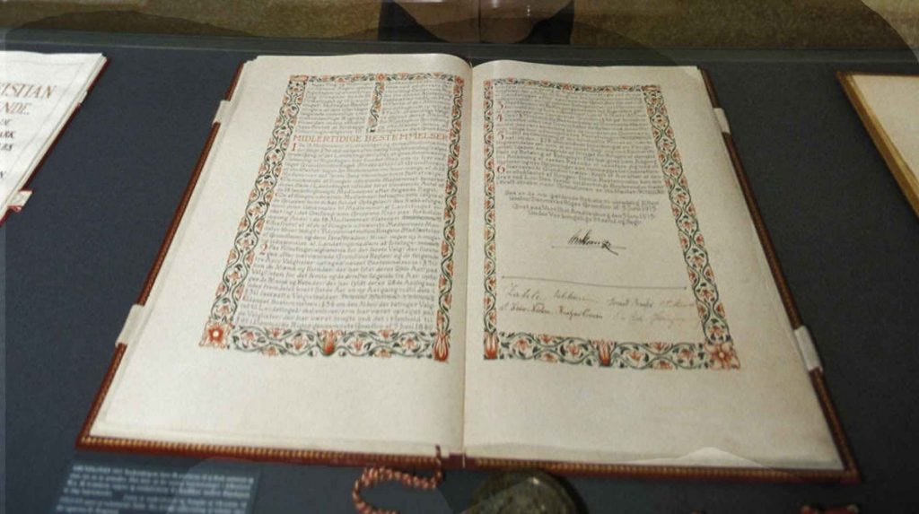 Danmarks Riges Grundlov af 1849 (-53) under Frederik VII med udgangspunkt i den første grundlov, der var Jyske Lov af 1241 under Valdemar Sejr. Betydning: overgang fra enevælde til konstitutionelt monarki og starten på de (nu udhulede og betydningsløse) demokratiske institutioner.