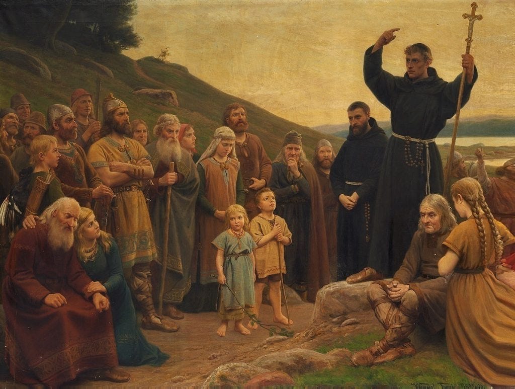 Nordens apostel, benediktinermunken Ansgar gjorde allerede i 826 benarbejdet, der senere kristnede de uregerlige danere. Han etablerede kirker i Hedeby og i Ribe. Så fik han et los i røven og blev smidt ud at Danmark, men han vendte tilbage. Han var også i Birka i Sverige. Interessant i øvrigt – en helt bevidst romersk og katolsk praksis – at missionærerne altid planter det kristne kors på de gamle kultiske steder og ‘sætter sig på dem’. De fleste kirker er bygget ovenpå såkaldt hedenske kultsteder, ligesom romerske templer blev bygget ovenpå templer fra de kulturer, de okkuperede og i mange tilfælde smadrede.
