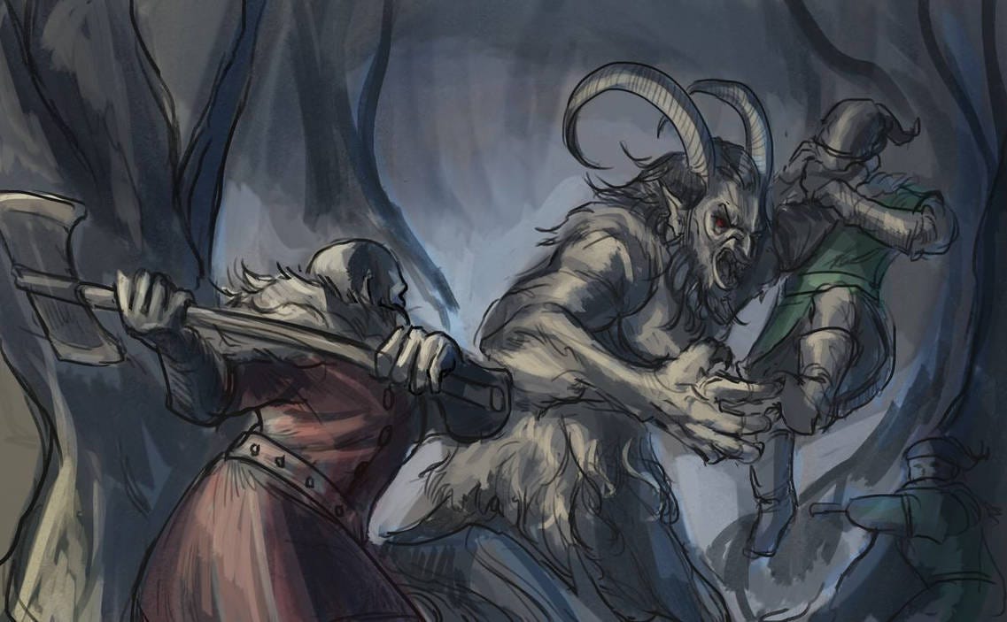 Saint Nicholas’s følgesvende har haft forskellige og skiftende navne spredt over landene Østrig, Schweitz, Tyskland, Bayern, Kroatien, Tjekkiet/Slovakiet og Ungarn, som landene hedder i dag. Skikkelser som Ruprecht, Krampus, Belsnickel (eller Kriskinkle) og Bellzebub dukkede regelmæssigt op i lokale fortællinger, som regel i form af dystre skikkelser med mørke, snavsede gevandter og ofte med monstrøse træk. På anden vis end deres helgenagtige kommandant havde de et ganske seriøst syn på små børns dårlige opførsel. I nogle traditioner blev børnene kaldt ud til døren for at underholde Julefar og Knecht Ruprecht ved at synge og danse. Hvis de gjorde et godt indtryk, fik de julegaver. Hvis de gjorde et dårligt indtryk, ville Ruprecht banke helvede ud af dem med en stok. I tilfælde af særlig uinspirerende performance eller for dem, der havde været uartige i løbet af året, ville Ruprecht smide misdæderne ned i en sæk, for derefter at tage dem med ud til sit pensionat i den mørke skov og æde dem levende, eller blot smide dem i floden, så de druknede. Glædelig Jul.