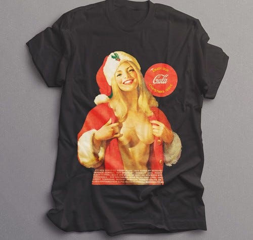 Coca-Cola og Sunny malede ikke Santa rød, det er en misforståelse, man tit hører. Biskopper som Saint Nick bar normalt røde gevandter, hvilket stadig kan ses i katolske kirker i dag. Hvad Coca-Cola imidlertid opnåede, var at gøre det til deres røde farve og at nedtone alle andre farver af grønt, sort og brunt via den ekstraordinære rækkevidde for deres reklamadollars. Altimens malede den utvivlsomt talentfulde Sunny seksuelt ladede glamourstykker for kalendere, hvor damer med kurver poserede, gjorde læber med munden og vinkede med diverse kropsdele. En af Sunny’s sidste illustrationer bestod af en yppig kvinde, der åbner sit santakostume, men hun skal til at blotte sine nøgne bryster. Det blev bragt på forsiden af Playboy Magazine i 1972 sammen med det røde badge, hvor der står: ‘Enjoy our gala Christmas issue’, med ordet gala i den specielle Coca-Cola typografi.