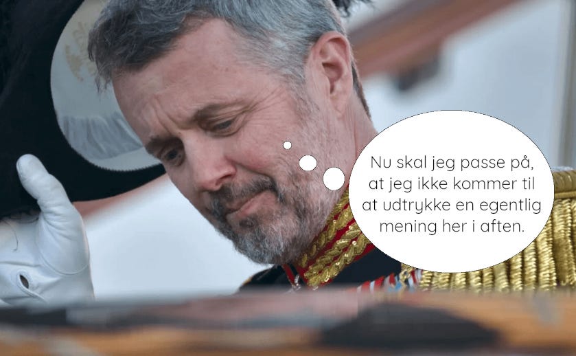 Der er dét ved kongehuset, at det er et mundstykke, og at husets beboere ikke har lov til at sige noget, der ikke er godkendt på forhånd. Når Frede Fup aka Kong Klaphat ankommer til det særlige nytårstale-rum med dertil indrettet globalist-tapet og sætter sig ved det fine mahogni-bord for at tale, så er ALT, hvad han siger, nedskrevet og godkendt af hans bagland Hofmarskallatet, der igen har modtaget deres godkendte inputs fra regeringen og ministerierne, der igen har modtaget deres input og forlangende fra globalisterne derude-deroppe i skyen.