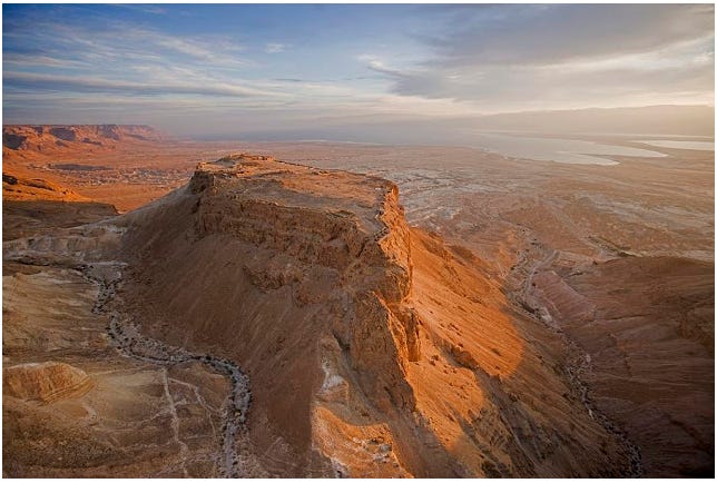 En klippefæstning formet som Vessica Pisces. Massada ligger ved det døde hav, der ses i baggrunden. Der er heller ikke langt til Qumran, hvor dødehavsrullerne blev fundet, og hvori ‘mesteren’ omtales. Ikke noget navn, bare mesteren.