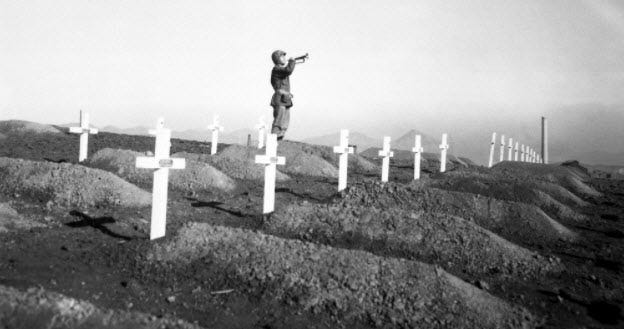 Seriøst! Det er noget i den stil, der bliver svaret, hvis du spørger 9,999/10.000 i den vestlige verden - bortset fra at ingen andre end danskerne har hørt om den mest velhavende popsanger i DK og sangen om Jutlandia. Men vi vil nu prøve at stikke spaden lidt dybere end endnu en popsang om emnet, og her tænker jeg ikke på Kim, og fred være med ham og hans millioner og finurlige hr. og fru Danmark-pop - og respekt for de døde. Jeg tænker på den mindre harmløse, men bestemt ikke mindre profitable ‘popsang’ eller salme, skulle man måske sige, som er afsunget om Krigen, ingen aner hvad handlede om. Den har en ubehagelig, men særdeles informativ historie at fortælle om vores egen tid, og vi kan ikke undgå at gå ud af diverse sidespor undervejs for at forstå paralleliteterne.