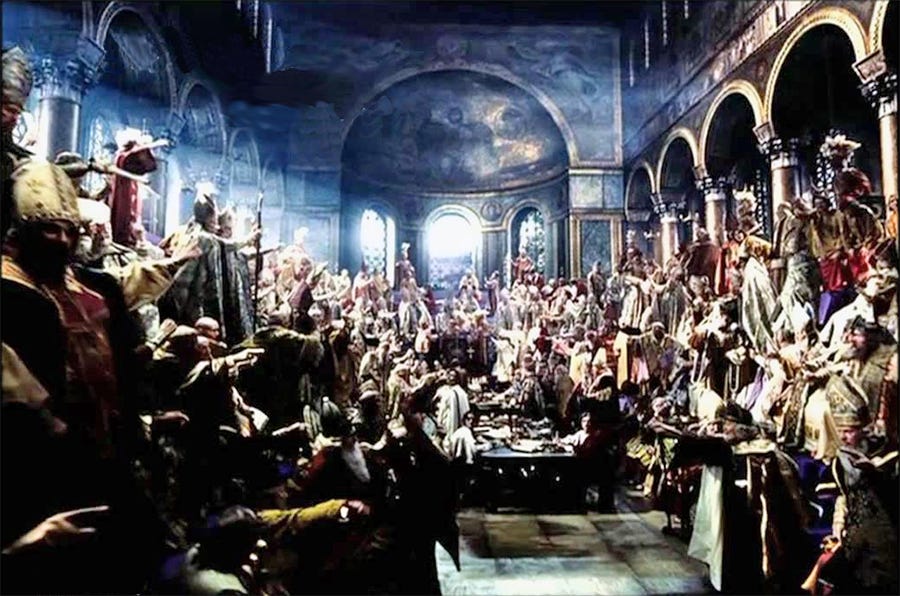 Kristendom gik fra at være den nazaræiske sekt indenfor jødedom til at blive et synkretistisk blandingsprodukt af babylonisk-persisk-egyptisk herkomst. Samtidigt er den en form for jødedom light, da den indbyggede Toraen og billedet af Jahweh med langt skæg. Det faldt på plads ved det Nikæiske Koncilium år 325, hvor 318 biskopper sad og råbte af hinanden som i det britiske parlament.