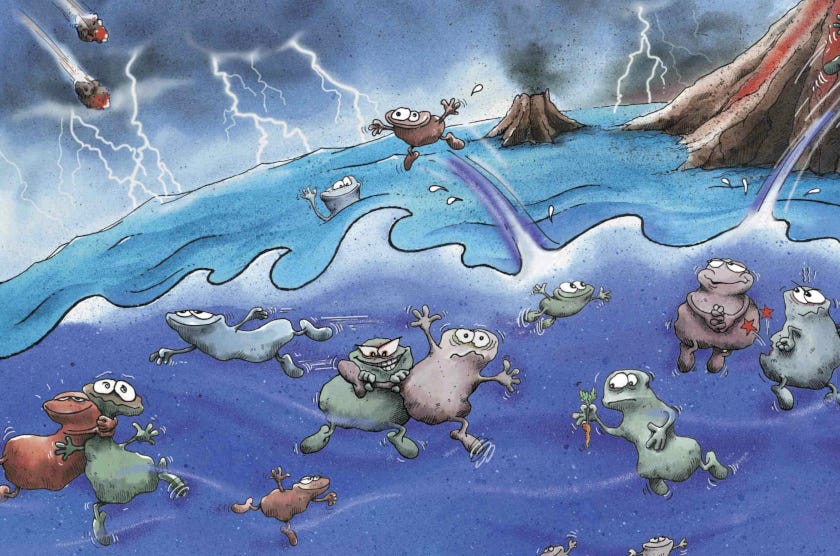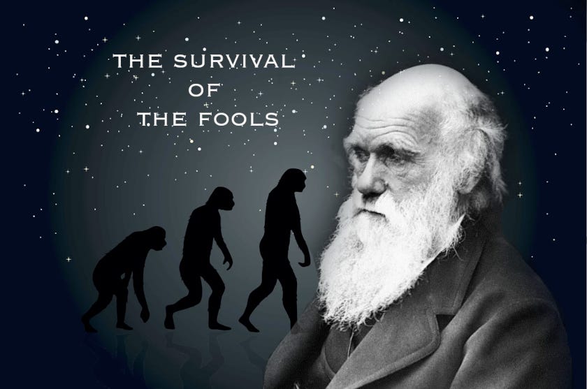 Darwinisterne løb med bolden uden at se sig tilbage, og nu sidder de et sted på banen og klamrer sig til bolden. Både med- og modspillere er linet op og siger: Kom nu, spil bolden videre! Det gør de ikke, og de sidder der stadig, når lyset slukkes på stadion samme aften. Sidder de der stadig og er blevet til mumier, når banen skal bruges næste dag?