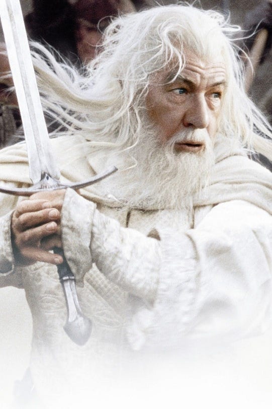 Vi elsker alle sammen myten om den gode troldmand, Gandalf den Hvide, der før havde opereret i gråzonen. Billedet indeholder reminiscenser fra en tid, hvor der muligvis fandtes en viden om, hvordan man lukkede Opfattelsens Døre. Når Gandalf, en omskrevet Merlinskikkelse fra de arthuriske legender, agerer i Ringenes Herre, er det altid som modsvar til den anden verden’s indtrængen i denne, gennem visse døre. Mordors døre åbner sig. Ringen åbner for den anden verden. Men det understreges samtidig, at ringbæreren herved påkalder sig dødsensfarlig opmærksomhed fra den anden verden, og at de små dumme hobbitter udsætter sig selv og andre for stor fare ved at gøre det. Det er kun ved genetableringen af naturlig lov, at dørene kan lukkes. Træerne ødelægger dæmningen og Sarumans uhellige underjordiske eksperimentarium oversvømmes, og så hører man ikke mere til ham. Ødelæggelsen af ringen, nøglen til den anden verden, ødelægger Saurons øje. Genoprettelsen af naturens lov sker ved indgriben af ørnene (ja, selv det mindste møl) og træerne og elverne, der alle repræsenterer naturens lov. Elverne er lidt af en tilsnigelse, for ifølge nordisk mytologi var de naturånder, elementaler, man skulle vare sig for. Så Tolkiens elver er romantiserede naturvæsner, der har lidt at gøre med de kilder, han ellers studerede, med flid.
