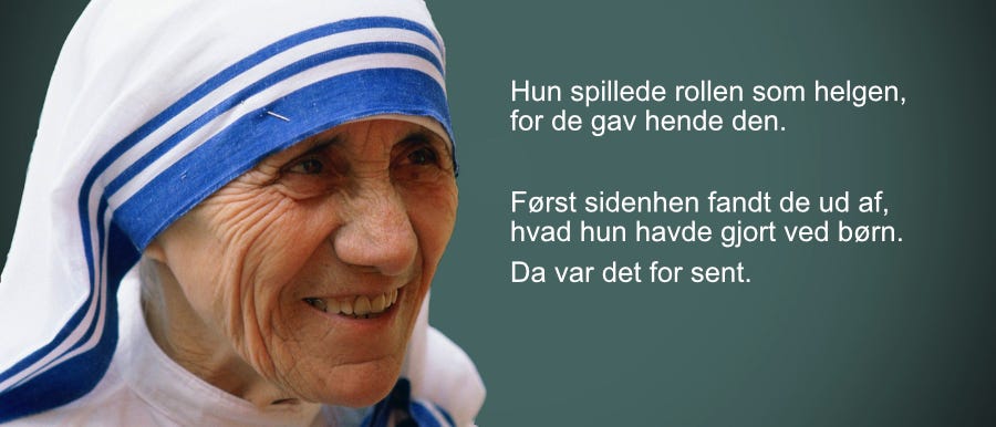 I 1979 bliver det decideret ondskabsfuldt. Mother Theresa bliver tildelt fredsprisen. Hun blev endda kåret som helgen. Vi ved i dag, hvad der foregik på de børnehjem, som hun var ansvarlig for. Mishandling, misbrug, udpining, underkuelse. Endog pædofili. Hun blev kåret som en helgen, men hun var en perverteret børnemishandler og psykopat.