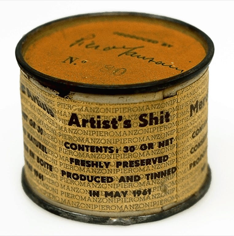 Det kunne være interessant, hvis en neo-aktivist-situationistgruppe ankom til museet og stillede sig op og rent faktisk pissede på kummen. Hvad ville Duchamp have sagt til det? Han er for længst død, så det kan vi ikke vide, men lad os som minimum gætte på, at kustoderne på vegne af kunstparnasset ville komme springende iført uniform og hønserøv og arrestere de formastelige. Hvad ville der være sket, hvis nogen havde medbragt en dunk lager-gylle og hældt ud over Kristian Lemmertz døde svin i montrer på Esbjerg Kunstmuseeum i starten af 1990’erne? Eller bogstaveligt talt sked på Piero Manzonis gule konservesdåser med egen afføring og titlen ‘Artists Shit’? Eller lod deres hund lette ben på Michael Brammers aflivede og udstoppede hundehvalpe? Eller tømte en flaske kinesisk fiskesovs på Marco Evaristtis guldfisk i en blender? Distancen, der ophøjede råddenskab til stor kunst, ville blive brudt, og stanken af virkeligheden ville bryde igennem. Kunstpostulatet ville falde sammen i sin egen grimhed, mens det velklædte, feinschmeckende kunstpublikum ville tage flugten fra stanken over hals og hoved. Skulle nogen få ideen, så er den helt gratis