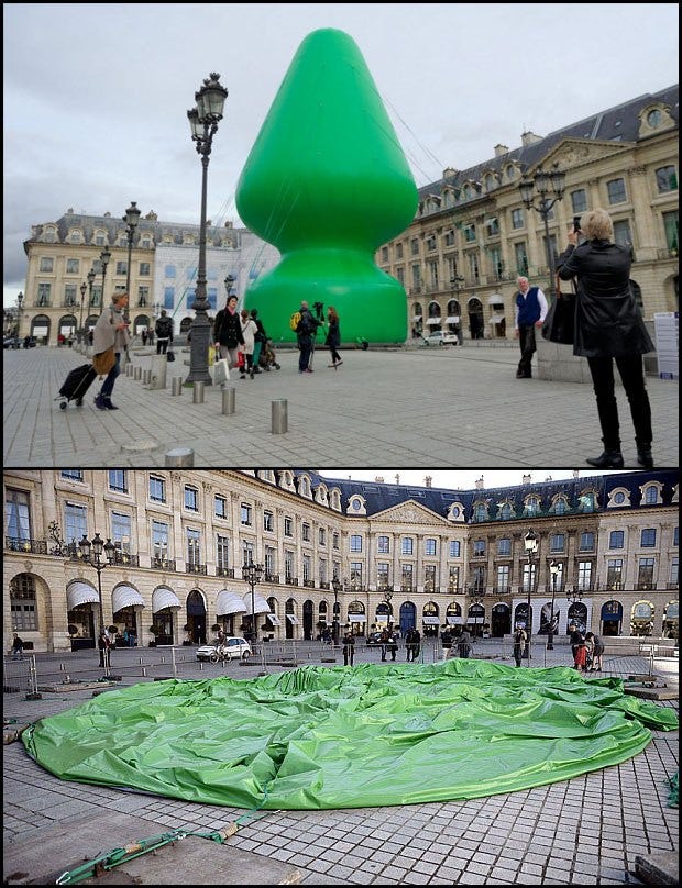 Noget i den stil skete rent faktisk i 2014, da kunstneren – for det kalder han sig – Paul McCarthy fik lov til udstille et kunstværk – for det kaldte han det – på Place Vendôme i Paris, en af de gamle pladser med dekorative palæbygninger. Værket var en gigantisk oppustelig buttplug, kunst i den kategori som kulturmarxisten og frankfurter-skolastikeren Herbert Marcuse ville have kaldt for subversiv perversion. Forbipasserende var tvangsindlagt til at passere forbi den enorme fuckfinger til fransk kultur og tradition, for det eneste i det afstumpede budskab var OP I RØVEN! Værkets levetid var ikke langt, for en tidlig tåget morgen blev det højhellige kunstværk udsat for et overfald, et lumsk angreb fra en aktivistgruppe, der iført hætter sprang ud fra sidegaderne, hvorefter de neddolkede og perforerede kunstværket. Pfffffffft – fra buttplug til bundskraber! Værket rejste sig ikke siden, for de havde ikke råd til så mange cykellapper. Personligt må jeg tilstå, at jeg grinede … pardon my French – min røv i laser.