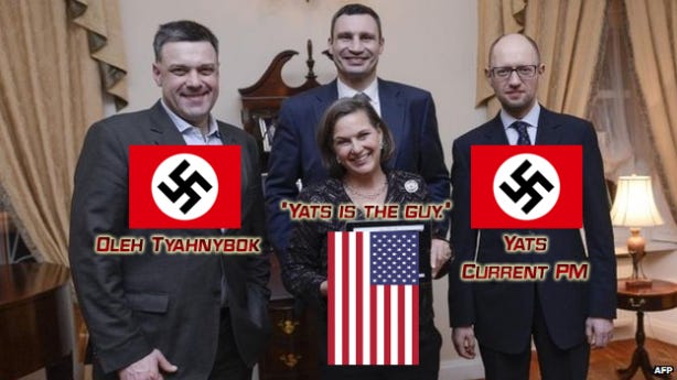 En af grundene er, at den amerikanske regering og dens iboende neocon-celler har været medvirkende til et statskup i Ukraine, hvor de har installeret ingen ringere end en vaskeægte ny-nazister! En anden grund er, som et højtstående medlem af regeringen for nylig udtalte offentligt: Det er ikke nazisterne i Kiev, vi er bekymret for. Det er nazisterne i Washington! (Yes! han sagde det sgu!)