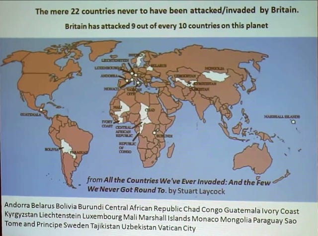 Briterne så allerede i 1800-tallet Rusland som hovedfjenden, fordi de var naboer til Indien, og fordi tsardømmet var gået hen og blevet lidt for succesfuldt og fremmeligt. Indien, kronjuvelen i Imperiet, blev regnet som selve forudsætningen for Imperiets overflod. Hvad englænderne, altså sørøver-slavehandler-drugdealer-racist-imperiet ikke har hevet ud af især Indien af ressourcer og skatte, er ubeskriveligt. Lad os gøre et ophold her og se på et verdenskort over alle lande på kloden, hvor det er langt lettere at overskue de lande, som IKKE er blevet overfaldet, udplyndret eller omstyrtet på en eller anden måde af Det Britiske Imperium. Der er kun 22 lande, som de ikke nåede at fucke up! Ikke at de ikke ønskede det, men de nåede det bare ikke! Hvor var det en skam, men så er det godt, at vi har amerikanerne, deres historiske metastase, deres mentale lillebror/muskulære storebror, British Empire 2.0 ...