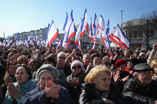 Affæren om Krim er særligt sigende for den særlige vestlige dobbeltmoral, når det kommer til demokrati-begrebet. Indbyggerne på Krim, der for størstedelen er russere, stemte med tydelig majoritet for optagelse i den russiske føderation. Straks forlød det fra Washington, at valget ikke var gyldigt. Det hed sig også, at Krim blev invaderet og besat af Rusland, selvom Krim altid har været russisk. Selvom Rusland havde indlemmet Ukraine, ville det samme have været tilfældet, for Ukraine/Kiev er selve fødestedet for det, vi forstår ved Rusland.