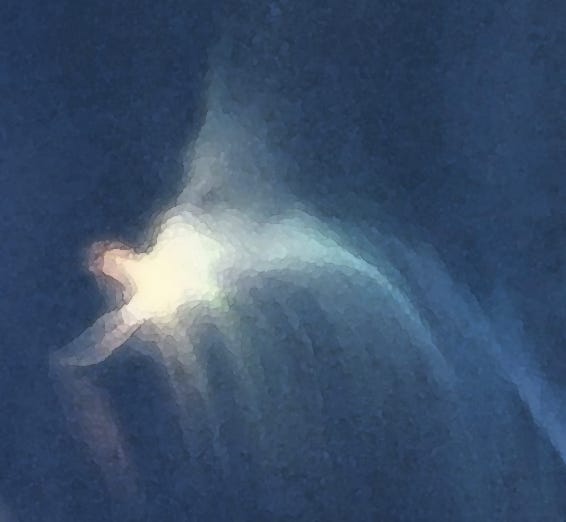 Lad os forstå det rigtigt. Fuglen eksisterer allerede i 3 dimensioner. Der er et øjebliks forvirring – og her kan vi for første gange tale om ‘et øjeblik’, hvor tiden og rummet rammer den luftige bevidsthed nedefra – så at sige – hvor den i forvejen eksisterende fugl flyver ind i den form for lavthængende skyformationer, der kendes under navnet tåge og overtages af noget ganske andet og ukendt, der rammer den – man kan måske sige ‘nødlander’ i det fjerede, luftbårne fartøj og sender dens fuglebevidsthed ud i skroget, hvor det i et splitsekund i nedfrossen tilstand lagrer sig i en bevidstheds-kuffert i dette fartøjs bagagerum.