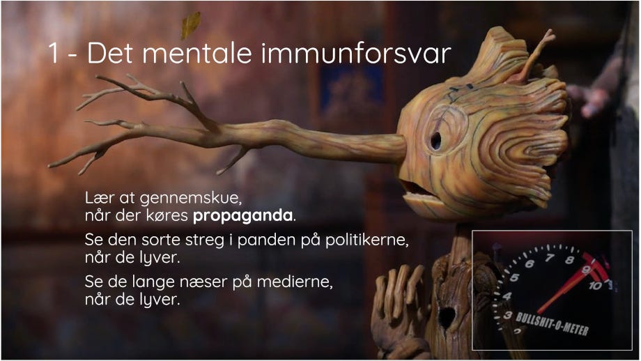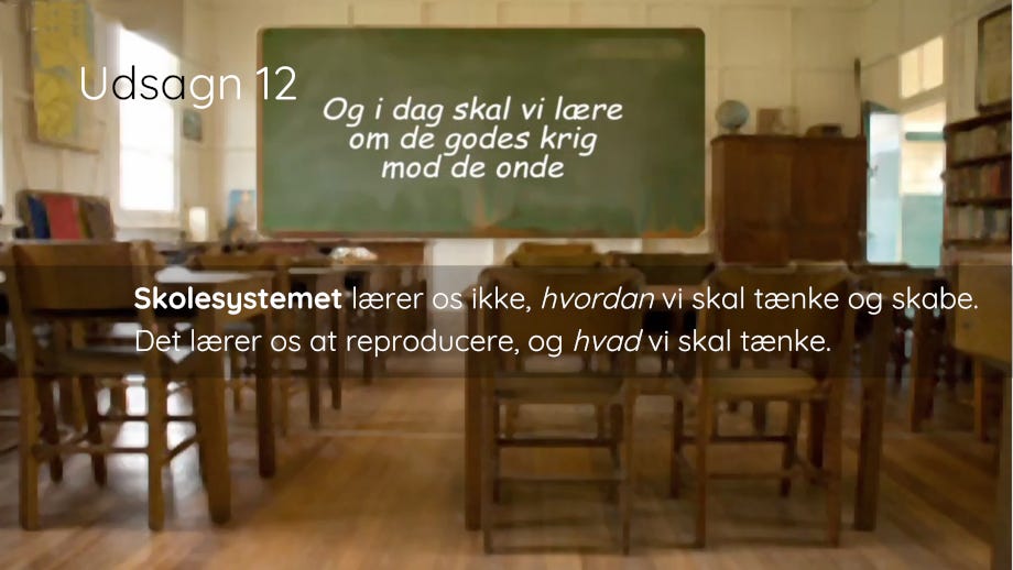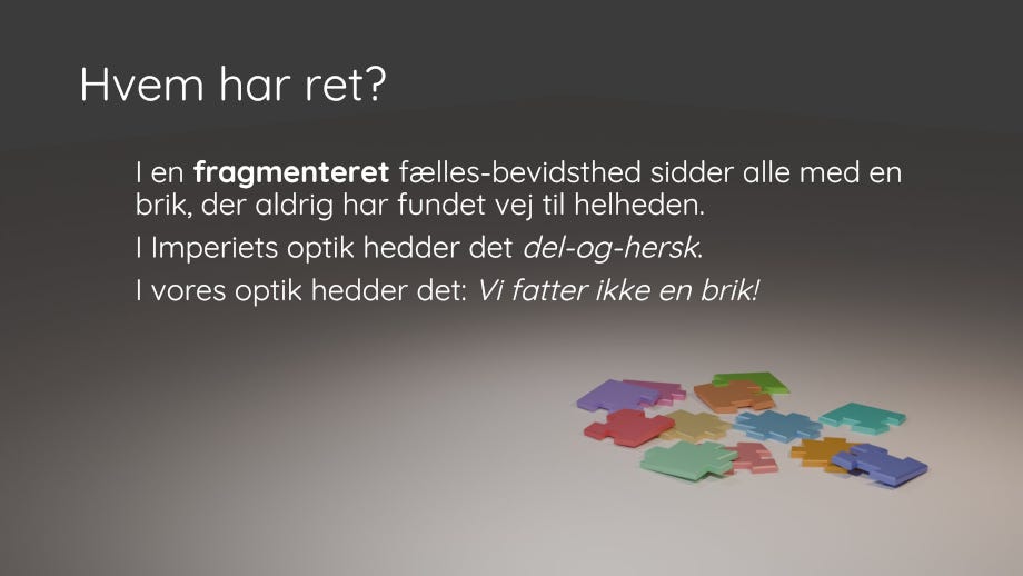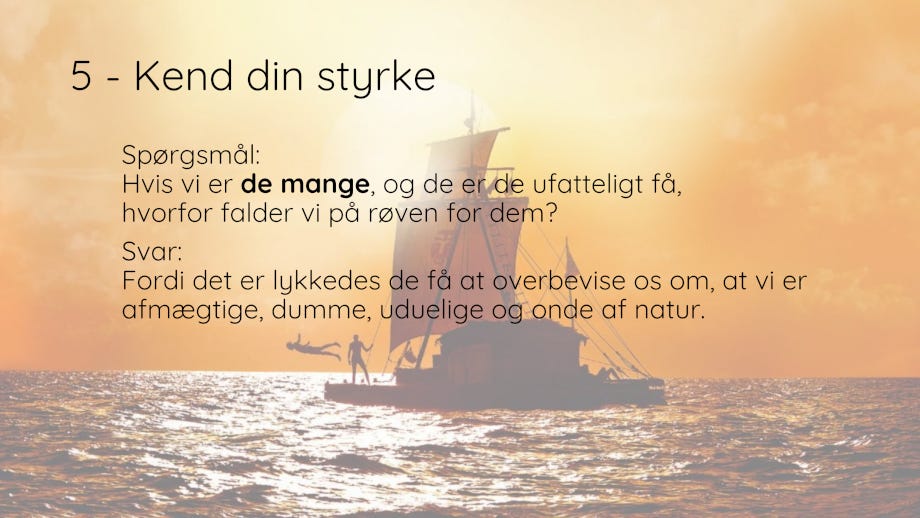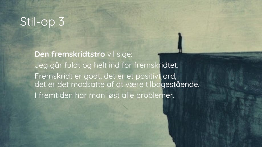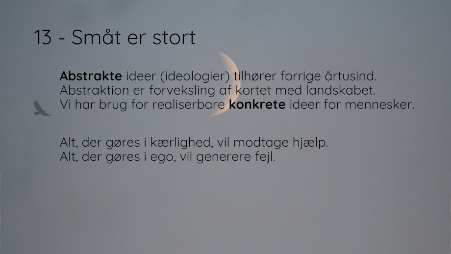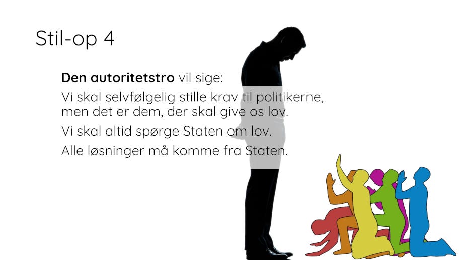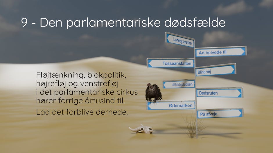 For at overleve i et verdenslandskab af døende kæmper har vi ikke brug for endnu en udgave af de ideologier, som de gav os i forrige århundred/årtusind. Vi har brug for simple løsninger på simple problemer no-nonsense no-bullshit. Vi har ikke brug for komplicerede abstraktioner men konkrete bud og tiltag.