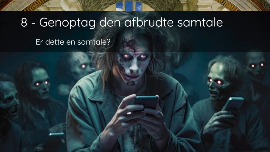 Mobilzombificering er ikke et bud på en samtale. Man kan bemærke ved ankomsten til f.eks en S-togskupé, hvordan 2/3 af kupeen sidder med hovedet nede i deres zombie-dildo, det digitale kokain. Deres kropsholdning er den dukkede nakke. Er det ikke en af de tilsigtede virkninger: duknakkethed?