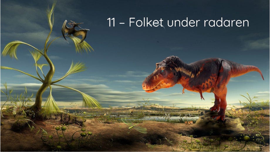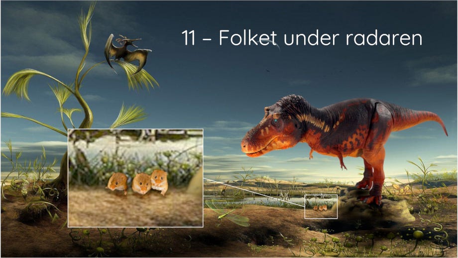 Og der var de, de små kræ. De var der allerede dengang og løb ubemærket rundt mellem benene på de døende kæmper. De fløj under radaren. Det var dem, der overlevede og bragte verden videre.
