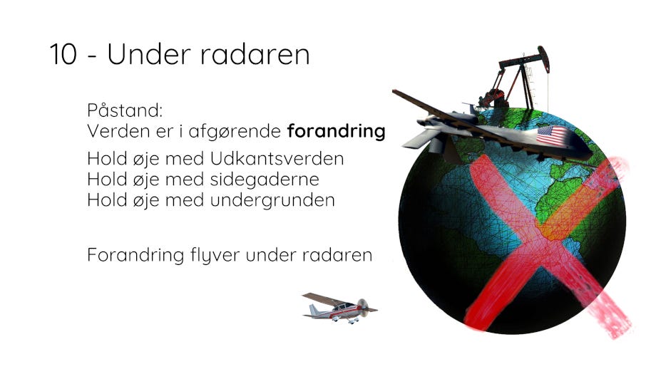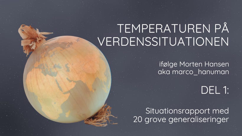 Vi starter med 20 grove generaliseringer. Vi bliver nødt til at tage løgpilningen af verdenslandskabet og tilstanden med et gran salt. Vi generaliserer for at kunne tale om det vel vidende, at det specifikke er langt mere varieret. Og vel vidende at vi gerne vil væk fra dette efterhånden dystopiske landskab.