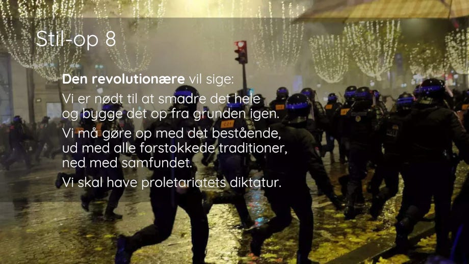 Et andet eksempel på ikke-samtale er den parlamentariske dødsfælde. Når man først falder i den, kommer man aldrig op igen. Den har varet siden slutningen af 1700-tallet, hvor de kongetro sad til højre i det franske parlament, og de revolutionære (jacobinerne) sad til venstre. De var venstrefløjen, og Den Franske Revolution var prototypen på Den Russiske Revolution. Vi er aldrig kommet videre.