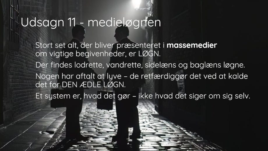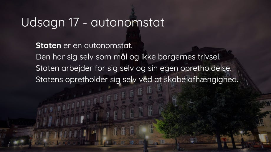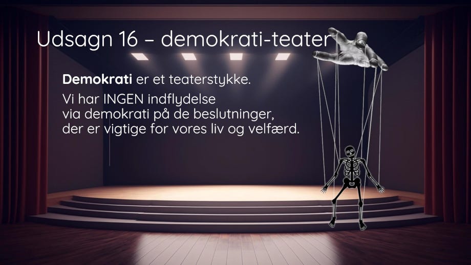 Parlamentet er det sted, der genererer udsagn – og de kan være nok så velmente – som de egentlige beslutningstagere kommenterer med: Vi hører, hvad I siger … for disse beslutningstagere bag skærmen er interesseret i at høre alt, hvad folk går og tænker og føler – ikke for at tilgodese folkets tanker og følelser men for at justere deres egne strategier for, hvordan de kan lade fuldstændigt hånt om disse tanker, følelser, behov m.m, så de bedre kan tilfredsstille deres egne begær.