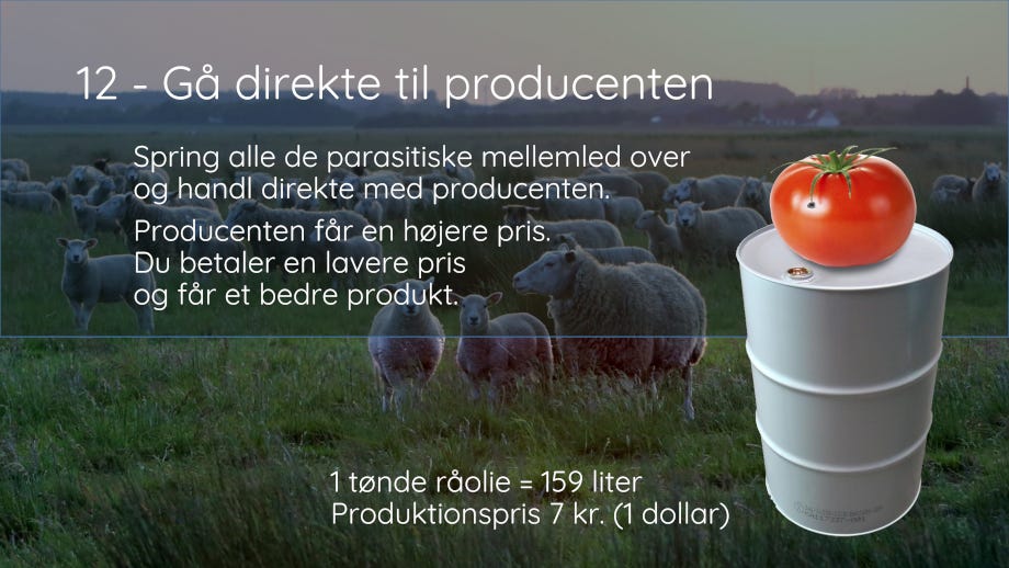 Da proxykrigen mod Rusland rullede ud for alvor, blev Rusland ramt af olieembargo. Eller gjorde de? Var det ikke snarere resten af verden, der blev ramt? For her blev alle elpriserne pludselig 3-4-doblede. El-kartellerne havde i forvejen aftalt at gøre det … fordi de kunne, og de kunne bare sige, at det Putins skyld det hele. Energipriserne påvirker alle andre prissætninger, så nu koster mange varer i butikkerne det dobbelte. Regeringer har som forventelig ikke gjort noget for at hjælpe deres befolkninger. Det er på tide, at gøre noget ved det selv, for en tomat koster det samme at producere i dag som for 50 eller 100 år siden. Mellemhandlernes parasitvirksomhed har skabt denne galopperende inflation. Dette er ikke markedsmekanismer, dette er hypergrådighed og udplyndring!