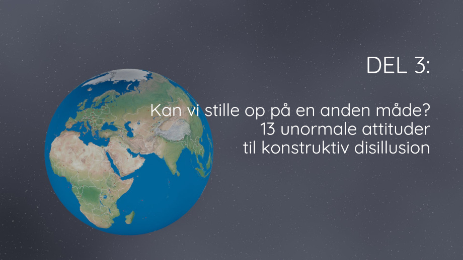 Vi er nødt til at skaffe os af med de store illusioner og punktere dem. Men vi skal ikke ende som triste desillusionerede mennesker ovre i det ene hjørne. Der er stor grund til optimisme, selvom der er mange forhold, der råber på pessimisme. Vi må insistere på at være nærmest kynisk-ukuelige i vores optimisme.