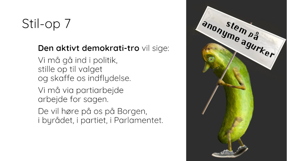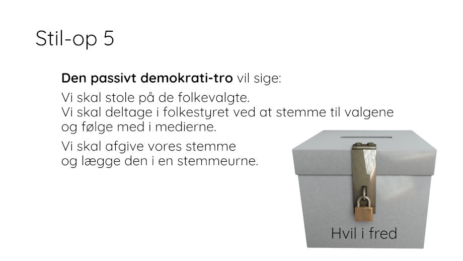 Parlamentarisme har spillet fallit både set ud fra et vælgersynspunkt såvel som fra et politikersynspunkt. Demonstrationer som i 60’er-70’erne imod Vietnamkrigen har ringe effekt, for politikerne er immunt-upåvirkelige og i en eller andet grad korrupte. De er lige så magtesløse som os, for de er omklamret af NATO-krigsmaskinen. Demokratiet er et teaterstykke, Borgen/parlament er et sort hul, der opsluger alle gode intentioner, gadens parlament er nemt at slå i stykker. Der er alt for lidt at vente fra det hold.