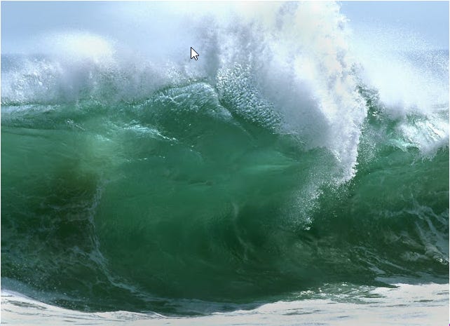 Først løb det ned af bægeret og hen ad bordet. Ved bordkanten væltede det udover og ned på gulvet, hvor det dannede et vandløb hen til døren. Et stykke henne ad gaden måtte en en hund måtte afbryde sit forehavende i rendestenen og springe for livet. På hovedstrøget var flodbølgen en meter høj og imod alle love og regler for korrekt opførsel for vand løb det op ad bakke.