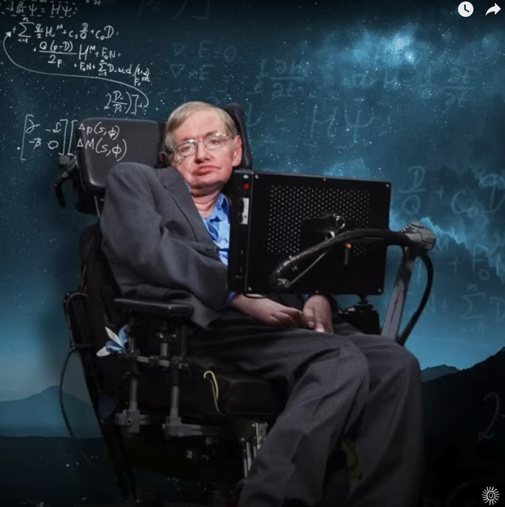 Stephen Hawkings først kone – hvad motiverer i øvrigt en kvinde til at gifte sig med en ultra-krøbling bortset fra et overdimensioneret moderinstinkt? og intet ondt om det – udtalte: